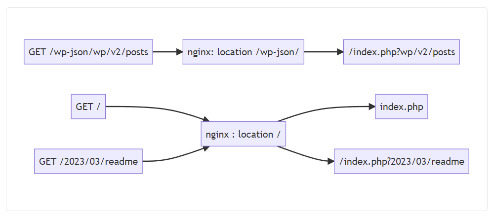 try_files行でindex.phpにrewrite先を記述する必要があるけど、通常の/にアクセスされた場合にwp-jsonも一緒に渡されるとダメ。